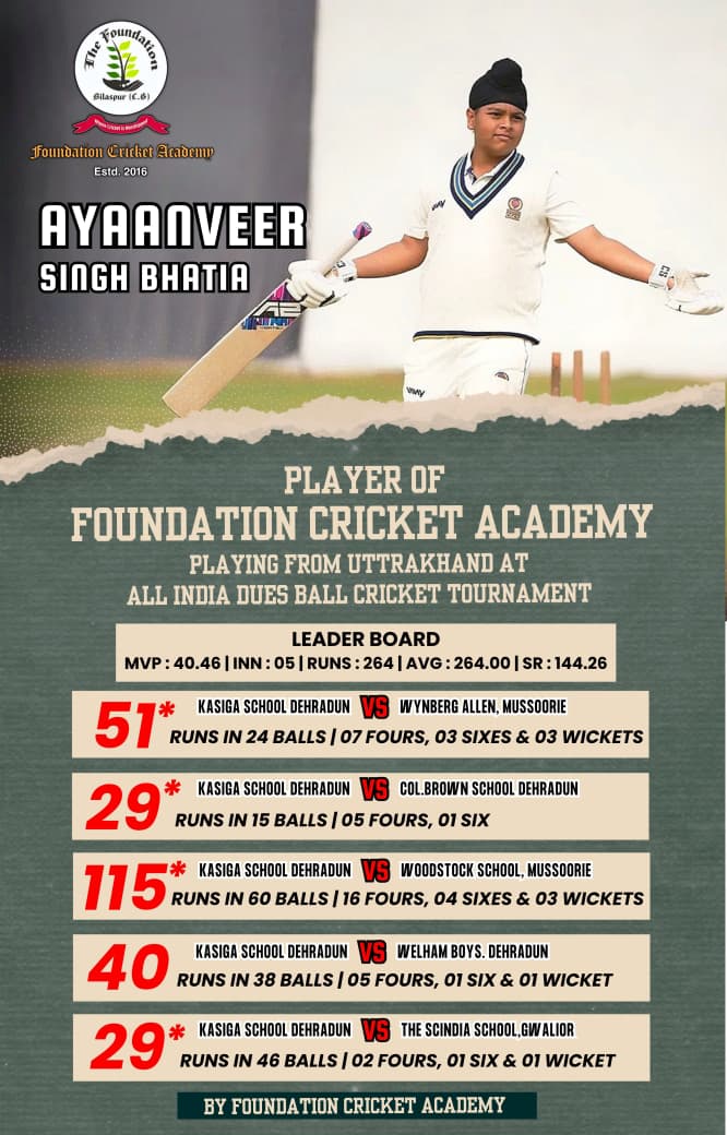 उत्तराखंड की चुनौतीपूर्ण पिच पर आर्यन ने अपने खेल से अलग पहचान बनाई। खास बात यह है कि अयानवीर ने महज 6 साल की उम्र में ही फाउंडेशन क्रिकेट एकेडमी जॉइन कर ली थी, और तभी से लगातार मेहनत करते हुए आज राष्ट्रीय स्तर पर अपनी प्रतिभा का लोहा मनवा रहे है,आर्यन की इस उपलब्धि से न केवल उनके परिवार बल्कि पूरे बिलासपुर और छत्तीसगढ़ का नाम रोशन हुआ है।